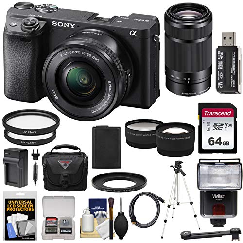 Sony Alpha A6400 4K Wi-Fi Digital Camera & 16-50mm & 55-210mm Lenses with 64GB Card + Battery + Charger + Flash + Tripod + Case + 2 Lens Kit
