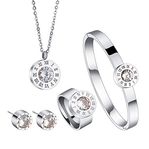 Panlady Exchangeable 7 Colors Cubic Zircon Jewelry Set Stainless Steel Crystal Necklace Earrings Bracelets Ring Valentines Day Birthday Gifts