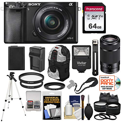 Sony Alpha A6000 Wi-Fi Digital Camera with 16-50mm & 55-210mm Lens (Black) with 64GB Card + Battery/Charger + Flash + Backpack + Tripod + 2 Lens Kit
