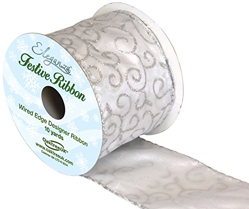 Oaktree UK Eleganze Satin Glitter Filigree Festive Ribbon, Silver