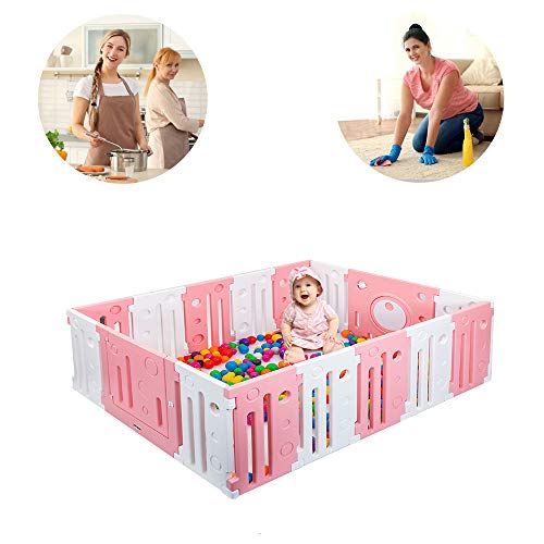 JOYMOR 16 Panels Baby Playpen BPA-Free Safety Anti-Skid Playards Kids Activity Center with Locked Door Indoor Outdoor Pink-White Fence