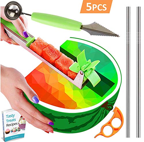 BEST SELLER Watermelon Slicer Stainless Steel + Slicer Cutter Knife Corer + 2 Reusable Straws + Orange Peeler - Fruit Vegetable Tools Kitchen Gadgets - No Mess - Less Stress (Green) + eBook