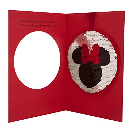 This medium Disney Birthday card includes a detachable fabric keepsake with reversible sequins, featuring both a Minnie Mouse and a Mickey Mouse design which can be sewn onto clothing.
