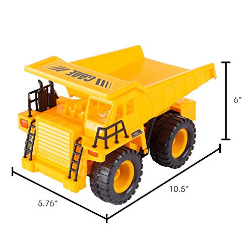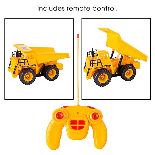 The Remote Control Toy Dump Truck by Hey! Play! is a fun and interactive toy that your child will love for years to come. This 1:22 scale wireless vehicle will move forward, reverse, left, right and features a dump bed that can move up and down. Your little construction worker will be able to maneuver this truck on semi-smooth surfaces like light sand and carpet, it has working lights and sounds, just like the real thing. Channels: 5 Color: yellow and black Dimensions: 5.75 in. L x 10.5 in. W x 6 in. H 6 functions: forward, back, left, right, dump bed: up and down Requires 2 AA batteries for remote and 4 AA for truck (not included) For ages 3 and up