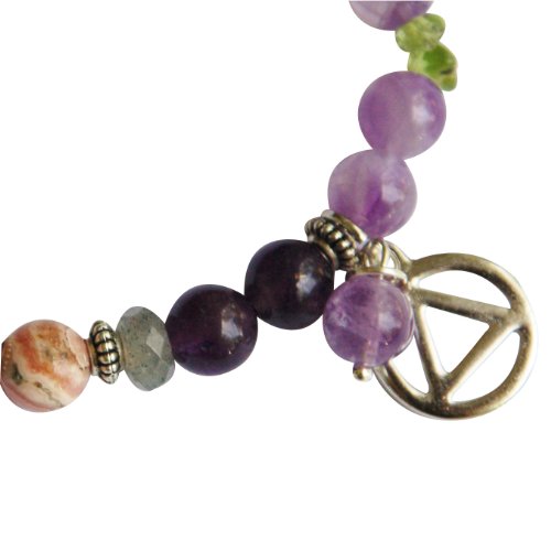 Our Serenity + Sobriety Bracelet was created using gemstones and symbols helpful in maintaining sobriety and a sense of peace. Amethyst is a widely recommended gemstone for assistance in overcoming and addiction. The word Amethyst comes from a Greek word, amethusos, meaning not drunk. We’ve used both light and dark shades of amethyst in our bracelet’s design. Amethyst is a stone of transformation, which is perfect on the path to sobriety. It helps to bring calmness and clarity where there is anxiety and confusion. Amethyst helps one learn of all things spiritual, mystic and psychic. Especially aids sobriety; alcohol, food, sex, and other addictions. Eases compulsive/obsessive behavior (desire for food, tobacco, drugs, alcohol, etc.) and has been used since ancient times in detoxification. Labrodorite promotes strength of will and a feeling of inner worth about your own abilities, while relieving insecurity and apprehension about your value as a spiritual being. Peridot is an emotional healer and helps cleanse the body of toxins. Rhodochrosite is an excellent emotional healing gemstone as aides in easing stress, anxiety and depression. It helps in alleviating any type of addiction, including food, drugs and alcohol, and it is helpful with issues related to abuse. Dangling from our Stretch Serenity + Sobriety bracelet is the silver dipped AA Recovery Charm. Dangling along with it is an Amethyst gemstone. Our Serenity + Sobriety bracelet measures 7 5/8″ and arrives to you in a gift pouch, ready for gift giving. Also included is a descriptive note card.