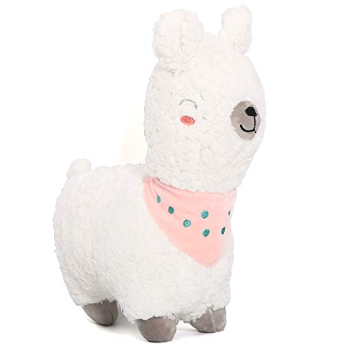 Plush baby llama with embroidered facial features and a pretty bandanna bib, stands 8 inches high
