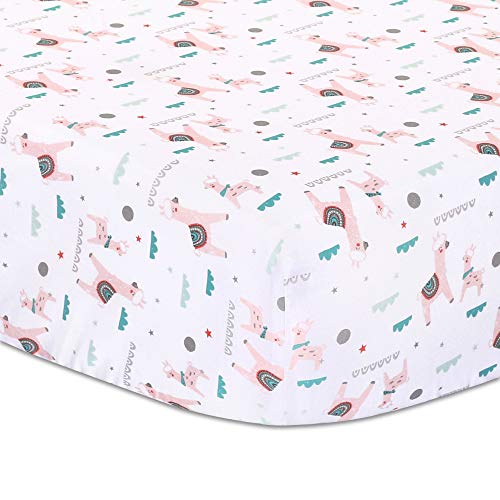 Fitted crib sheet features a tossed print of llamas and geometric patterns and is designed to fit a standard sized crib with a mattress measuring 52 by 28 inches; all-around elastic and 8 inch pocket will assure that the sheet fits safely and securely every time; included fitted crib mattress pad provides waterproof protection beneath the sheet and mild additional cushioning to be consistent with the firm sleep surface recommended by pediatricians
