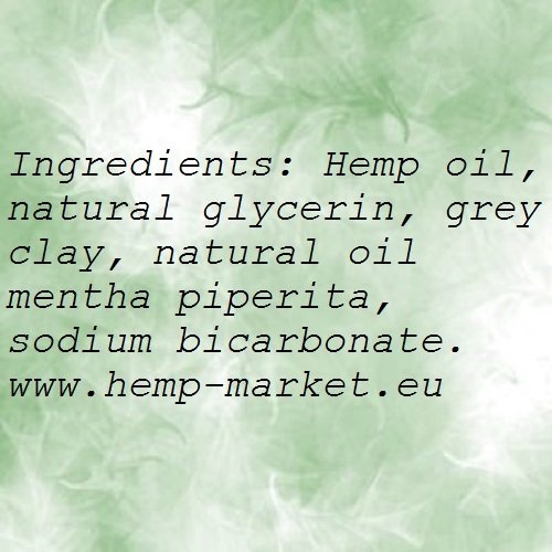 Ingredients: Hemp oil, natural glycerin, grey clay, natural oil mentha piperita, sodium bicarbonate.