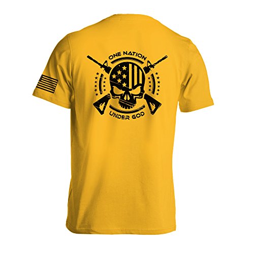 Dion Wear® original design – One Nation under God military t-shirt. This unique design, which resembles crosshair, features a skull with One Nation under God written on top and bottom, surrounded by a circle with two automatic rifles crossed and stars on each side. Design is printed on the back of the shirt with a smaller version on the front left chest side and American flag is printed on the left sleeve. This custom designed t-shirt is printed using top quality all around. Screen printed using high quality inks and cured with top grade equipment, not the low quality direct-to-garment (DTG) printing that wears and washes off, simply said our shirts are meant to last. T-Shirt quality is a preshrunk 5.3oz, true-fit, making it perfect for any occasion. Printed with pride in USA!
